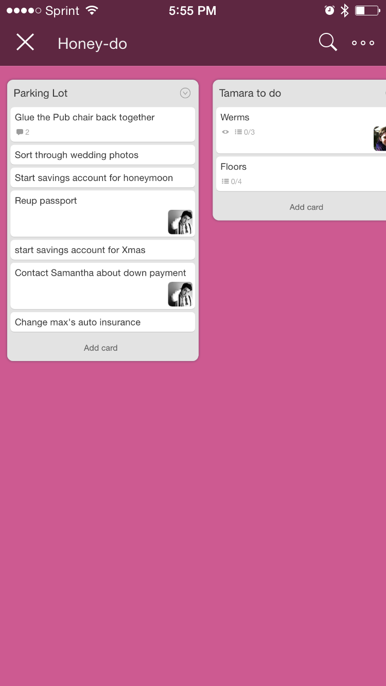 Trello: This is a to-do list and productivity app that uses the Kanban method for organizing tasks into assigned, doing, and done. You don’t have to know a lot about Kanban to use Trello, and you don’t have to know a lot about Trello for it to improve your life. We used it to organize wedding tasks (and our sanity) and now we use it to organize our household honey-do list.